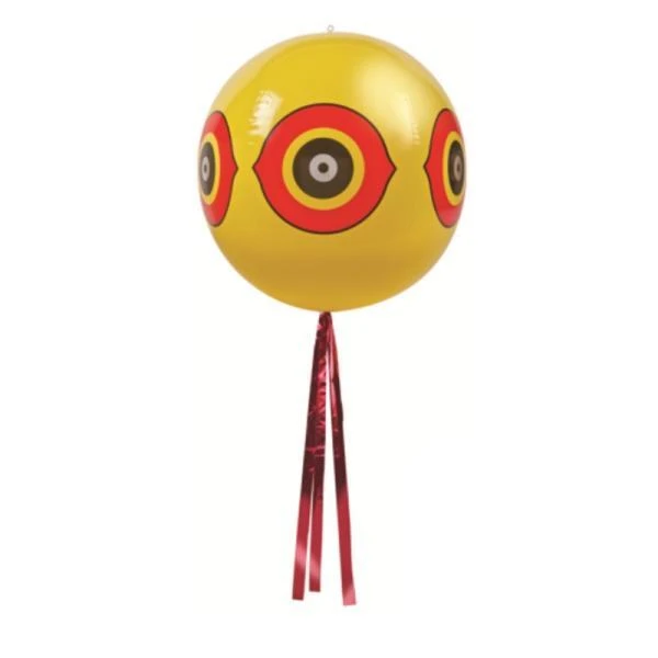 Vogelschrikbal met grote reflecterende ogen en een wapperende staart. Ideaal afschrikmiddel tegen overlast van vogels in boomgaarden of gewassen. Hang de opgeblazen ballon aan een paal of in een boom en schrik de vogels op die manier af.
